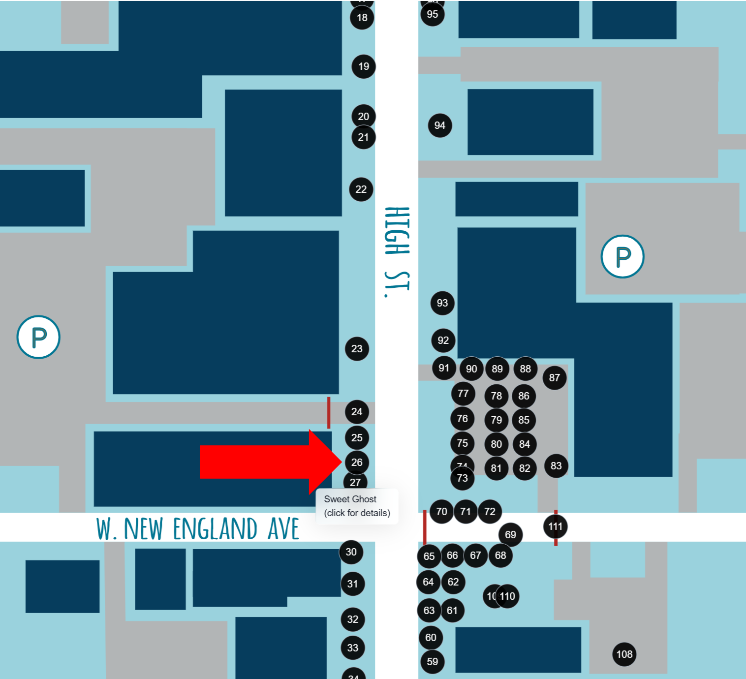 We’re located at stall 26 between the old Worthington Inn and Joya’s near the corner of High St and W New England Ave.